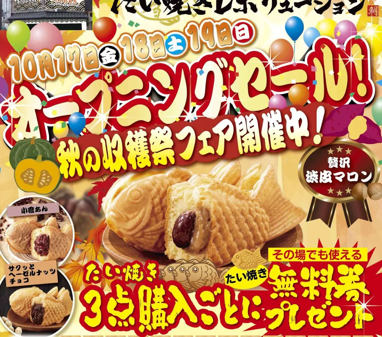 オープン日の10月17日から19日までの3日間はオープンセールを開催。たい焼き3匹購入ごとに「たい焼き無料券引換券」1枚がもらえます。これはうれしい〜!いろいろ食べ比べたくなりますね。
