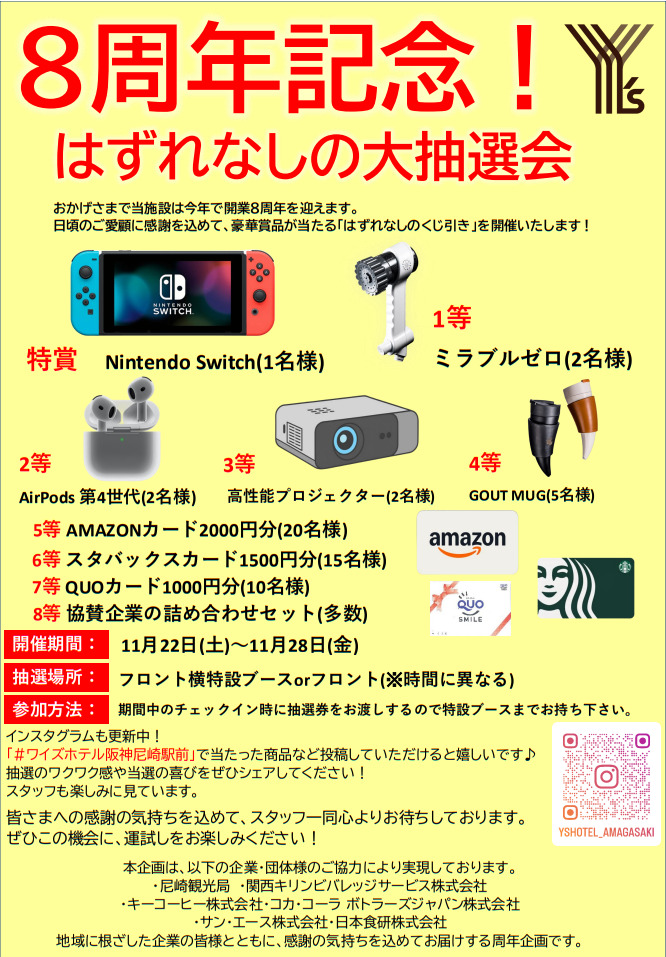 2025年11月25日に開業8周年を迎える「ワイズホテル阪神尼崎駅前」が、特別宿泊プラン&豪華抽選会を実施します♪