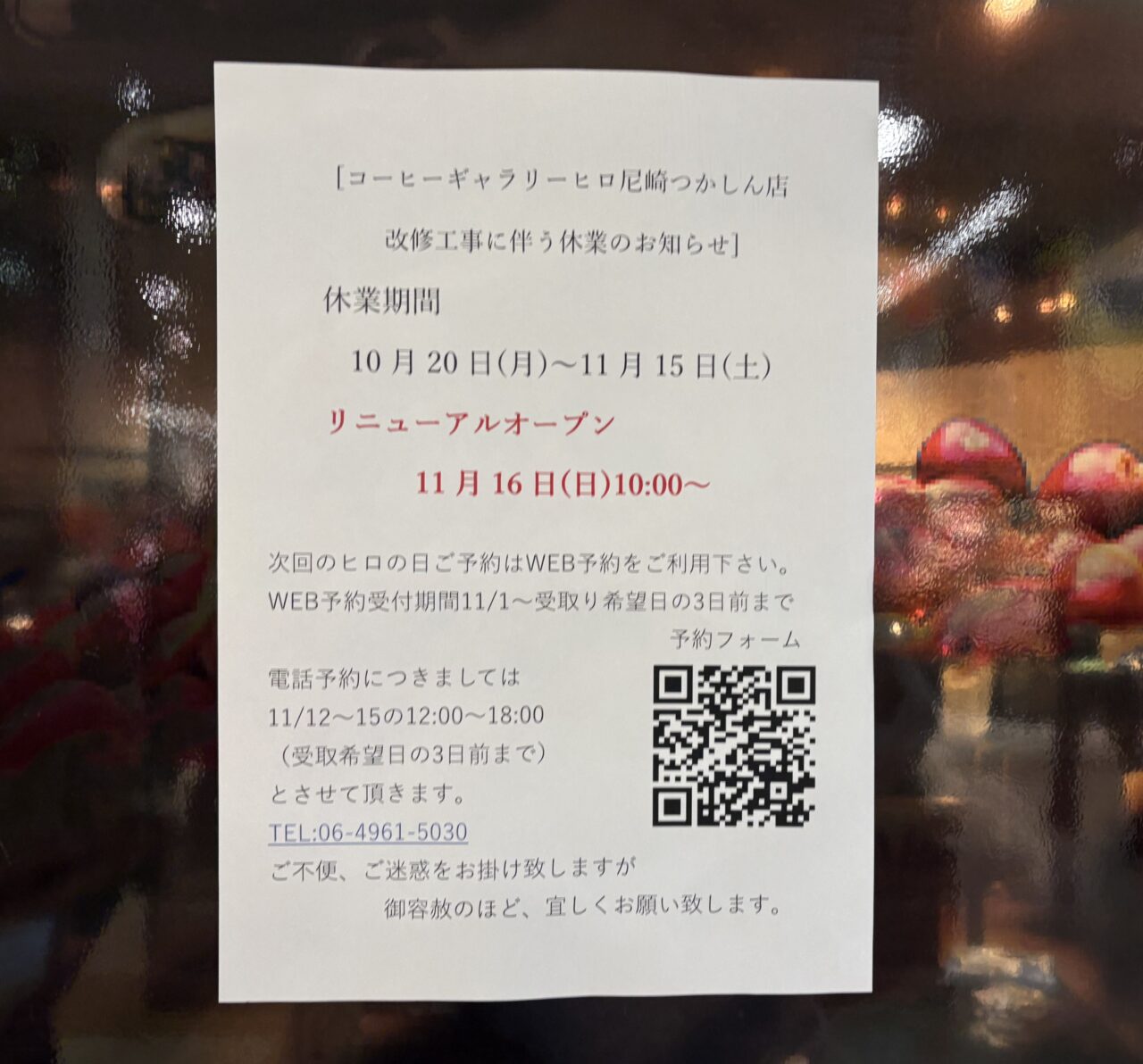 【尼崎市】つかしんの「コーヒーギャラリーヒロ」が改修工事のため休業中。11月16日リニューアルオープンです♪