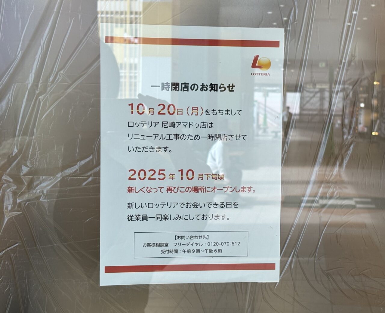 旧ロッテリア尼崎アマドゥ店は、2025年10月20日からリニューアル工事のため休業になっています。もしや、ここがゼッテリアになるのでは?と予想していた方もいらっしゃるのではないでしょうか。