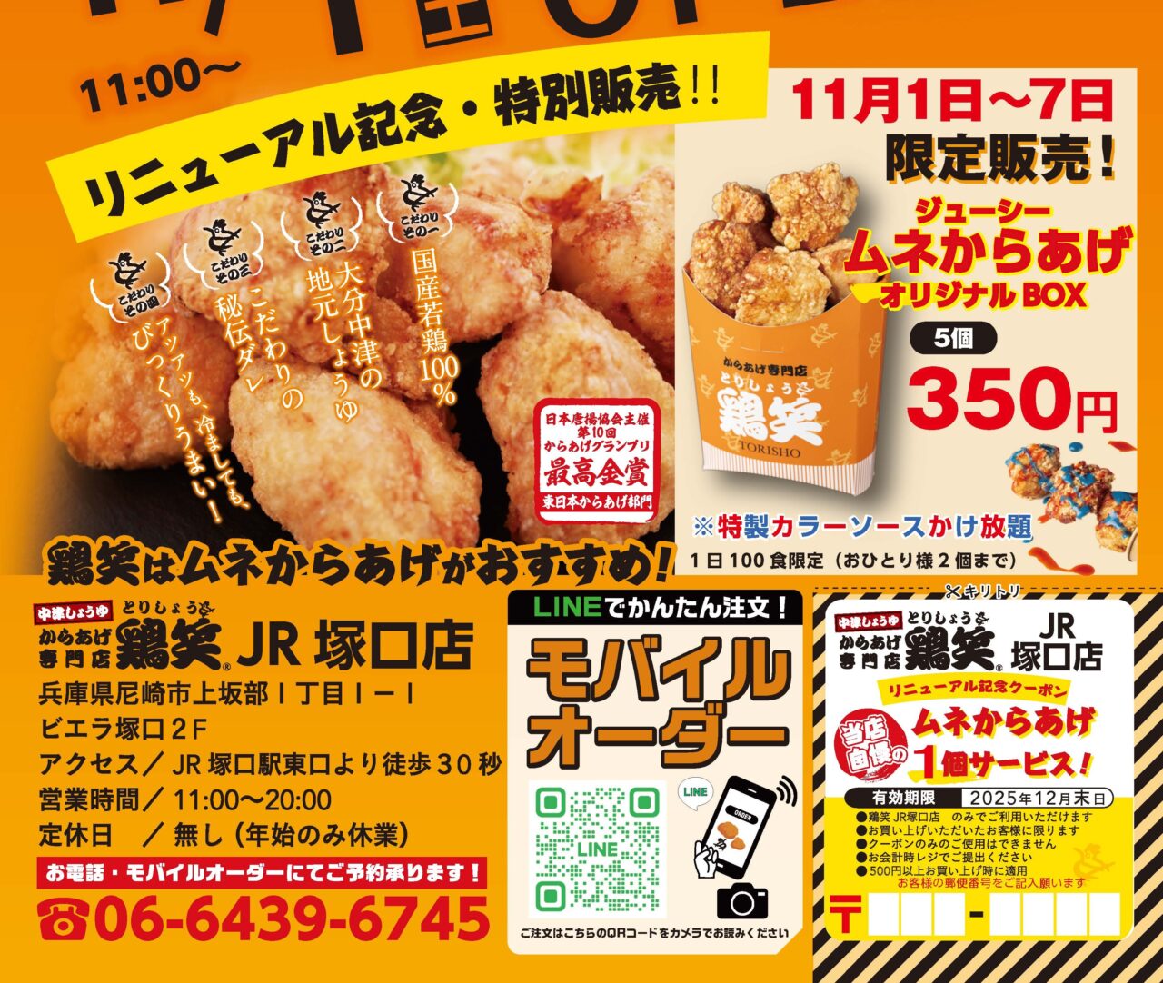 【尼崎市】からあげ専門店「鶏笑JR塚口店」が11月1日にリニューアルオープン!オープンキャンペーンも要チェックです♪