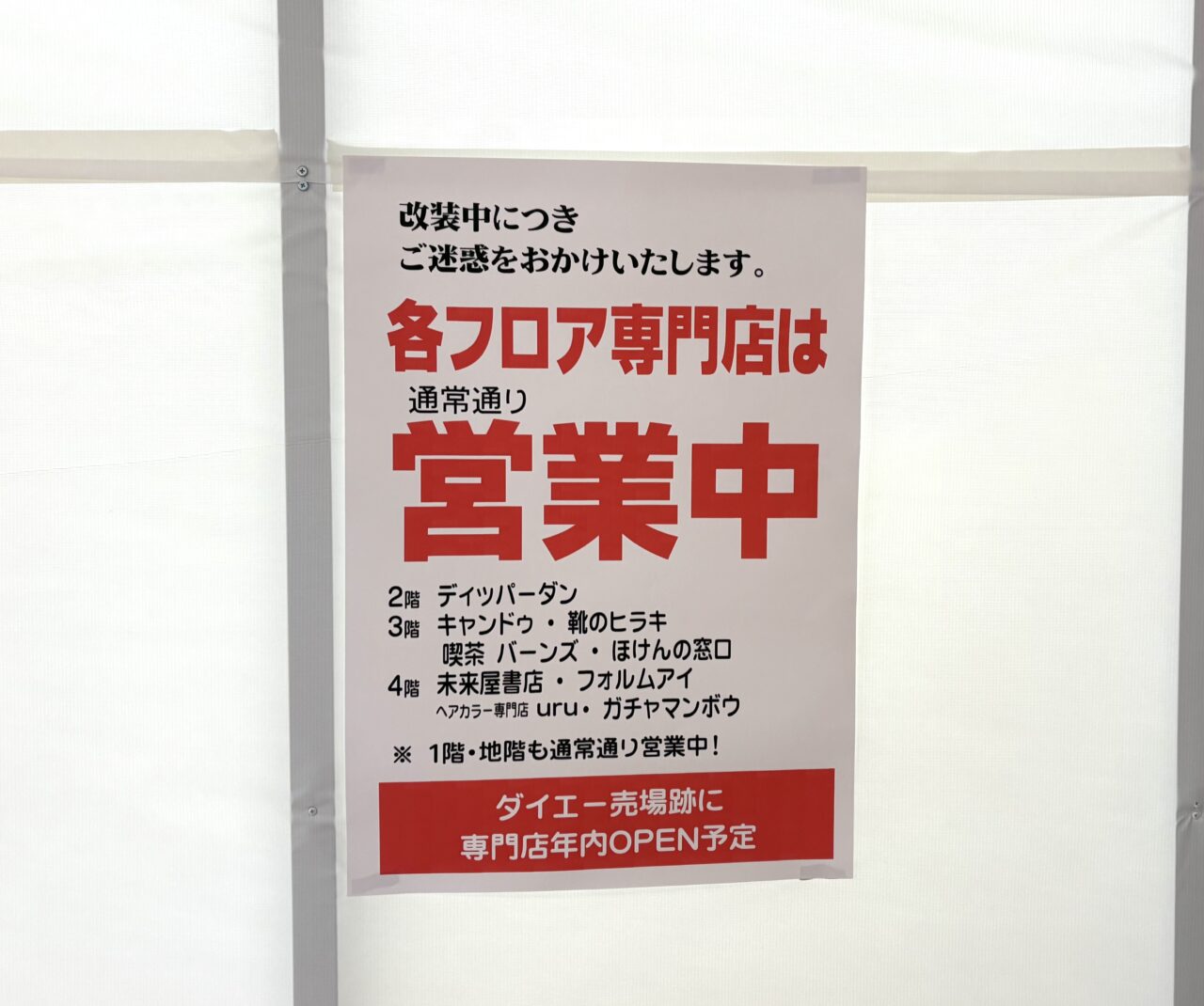 ダイエー売り場跡地は年内に専門店街としてオープン予定なので、3階フロアなど年内に何やら変化がありそうですね。何かわかり次第、続報をお届けします。