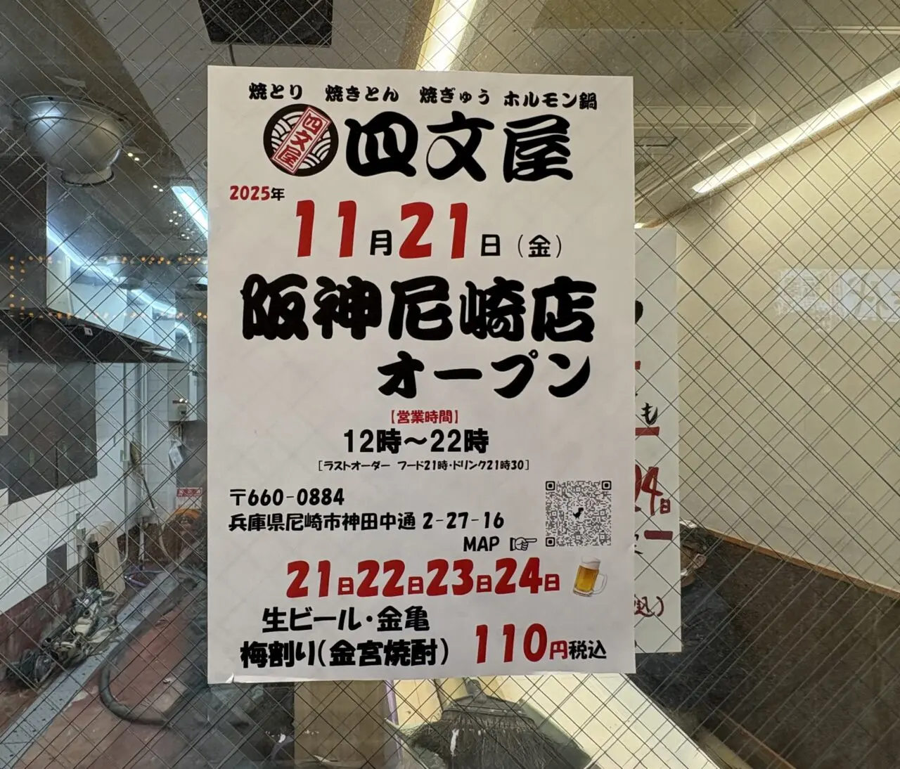 阪神尼崎駅前、尼崎中央商店街に、焼きとり・焼きとん・焼き串で有名な居酒屋の「四文屋」がオープンするようです。