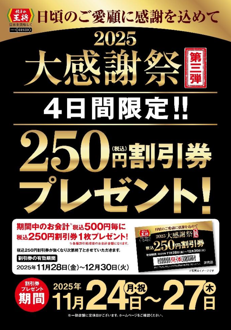 お客様への感謝の気持ちを込めた特別企画として、期間中のお会計税込500円毎に税込250円割引券を1枚プレゼント!王将ファンならちょっとスルーできないキャンペーンですね。11月24日~27日『大感謝祭 第三弾』開催のお知らせ