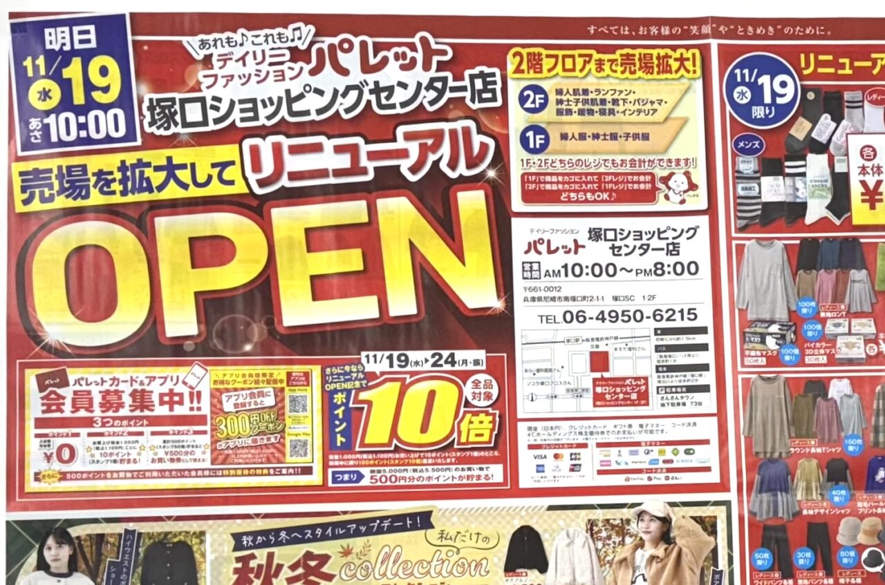 塚口さんさんタウン1番館の1階にある「パレット」が旧ダイエー塚口店の2階に売り場を拡大、2025年11月19日にリニューアルオープンしました。
