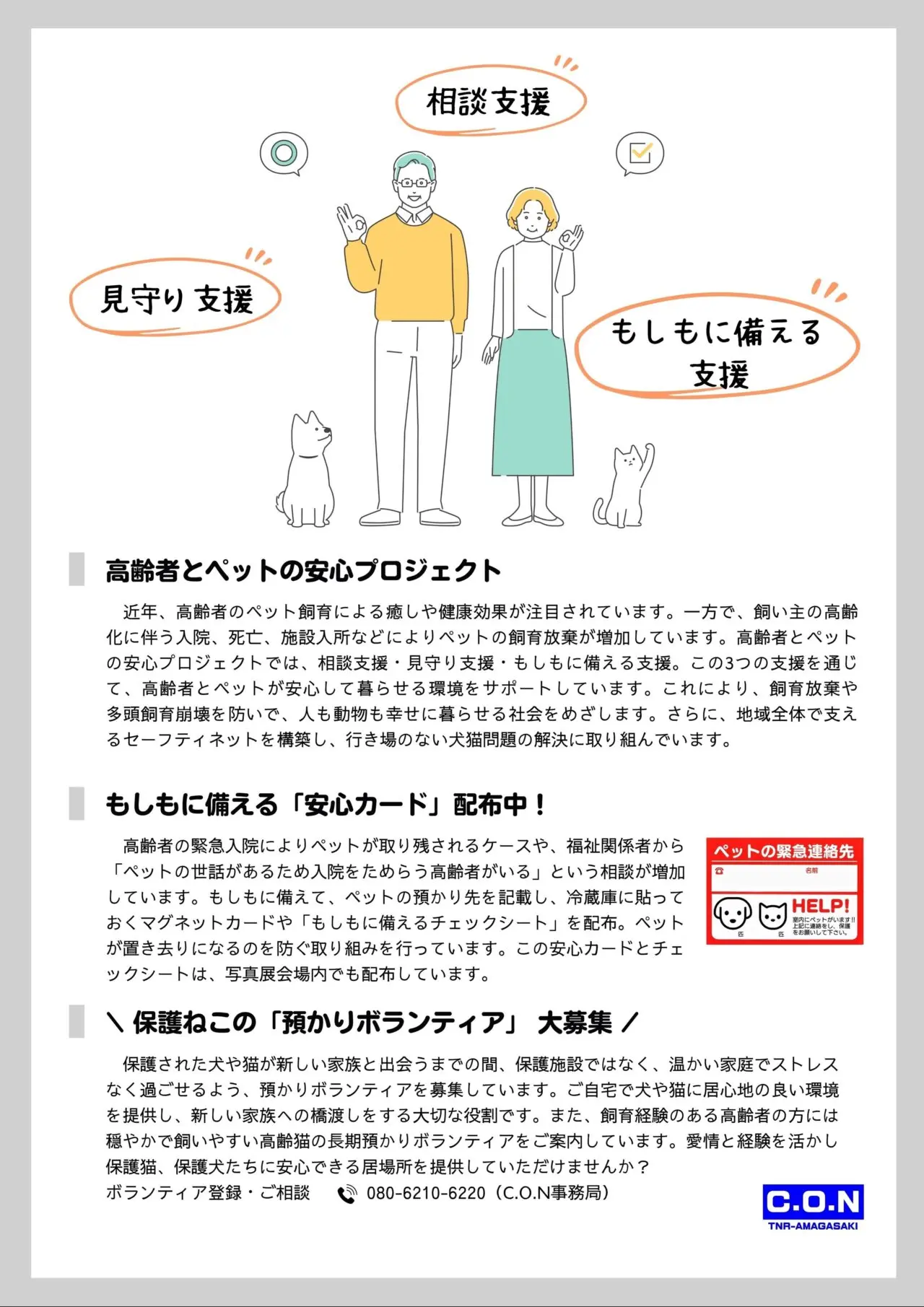 また同時開催として、高齢者と高齢ペットが支え合いながら絆を築いた5件の事例を「高齢者とペットの今をみつめて」と題して写真で紹介。さらに、高齢飼い主の入院や死亡による飼育放棄が社会問題になっている現状を踏まえ、会場では「ペットとの終活 相談コーナー」も設置しています。緊急時に役立つ「高齢者とペットの安心カード」や、ペットとの将来に備えるための「もしもに備えるチェックシート」の配布も行われます。