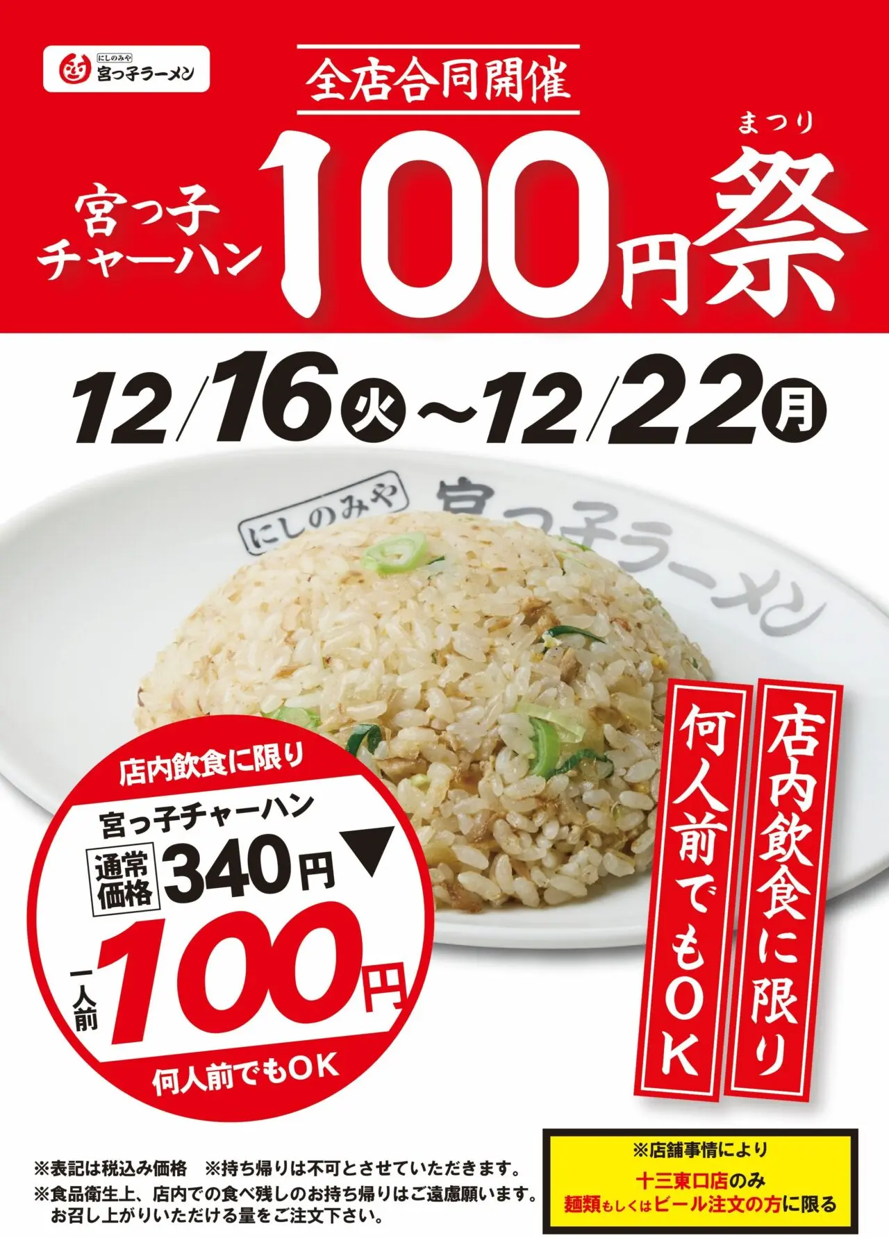 期間は2025年12月16日から22日まで。人気メニューのチャーハン、通常340円が一人前100円に!注文制限なく、店内飲食に限り何人前でも注文できます。