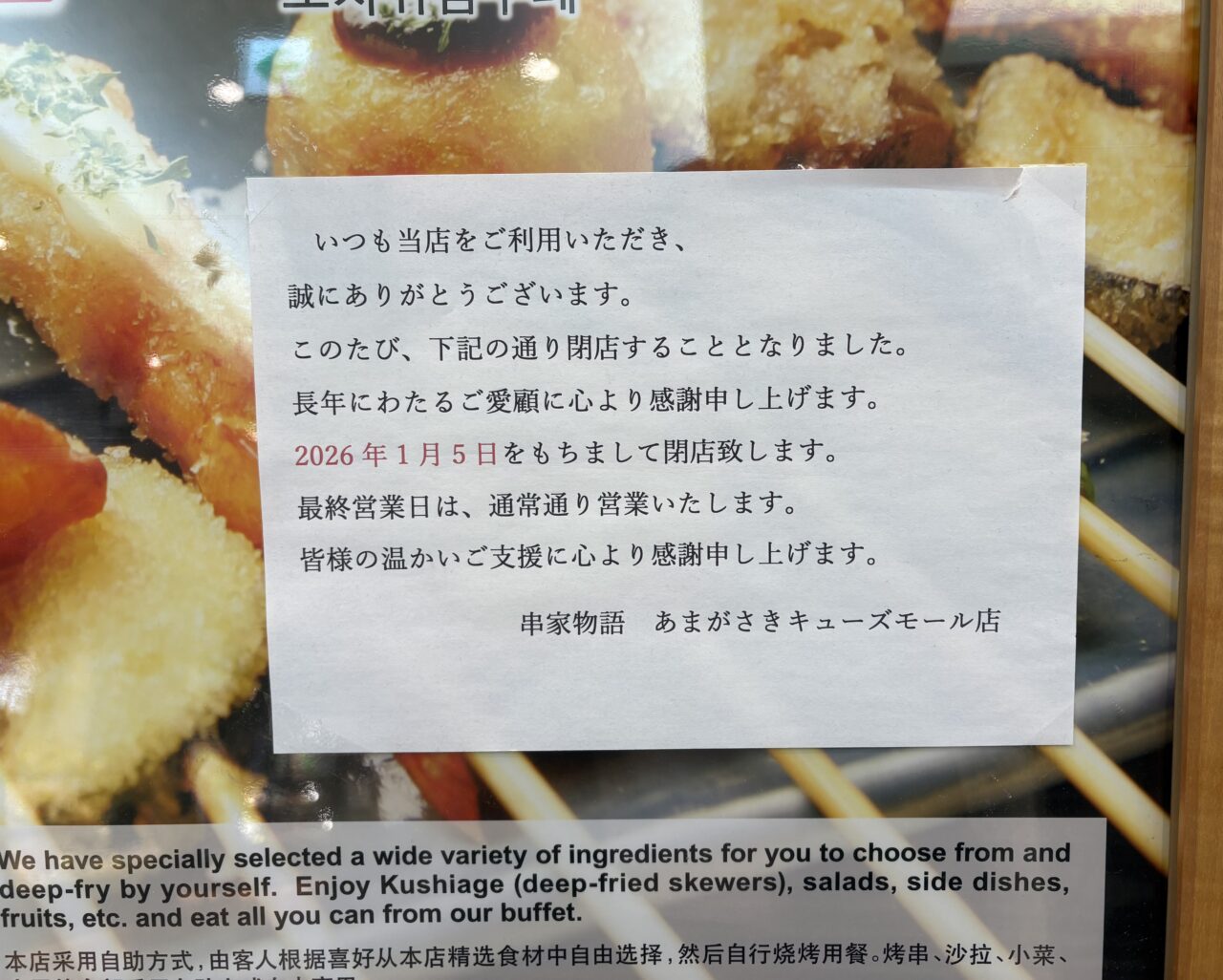 【尼崎市】あまがさきキューズモールの「串家物語」が閉店するようです。閉店日は1月5日。