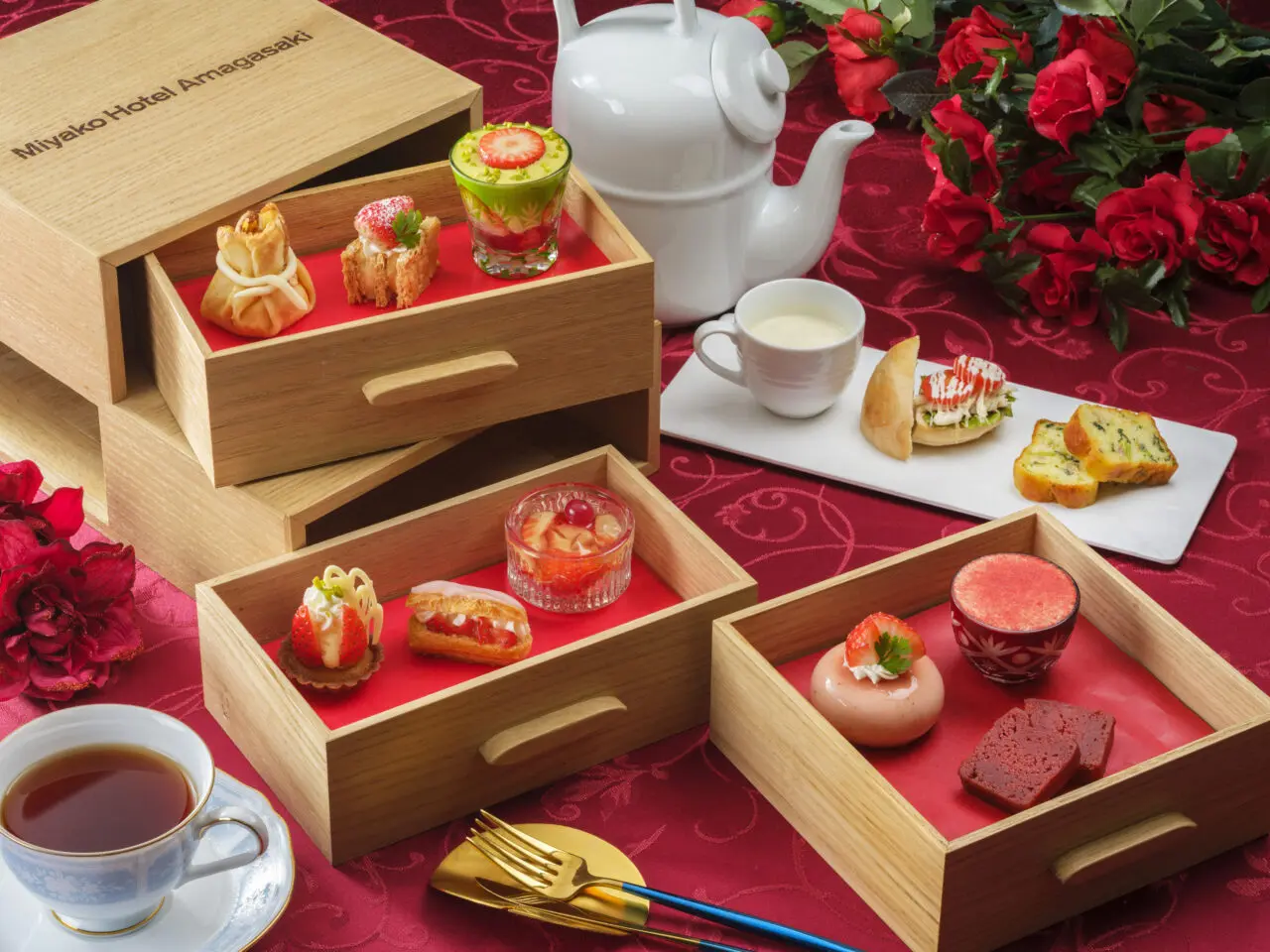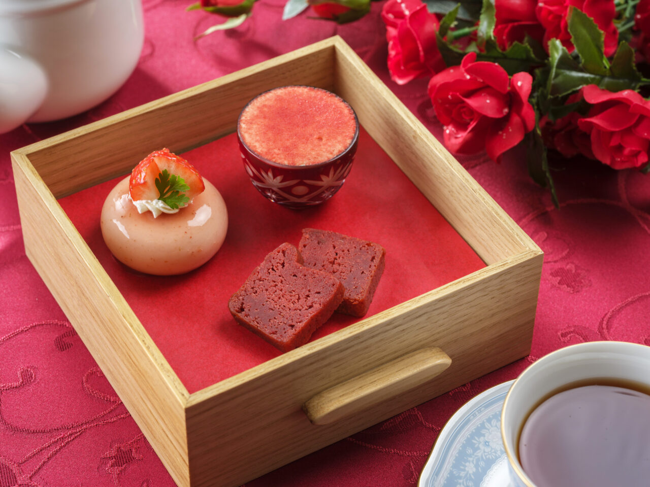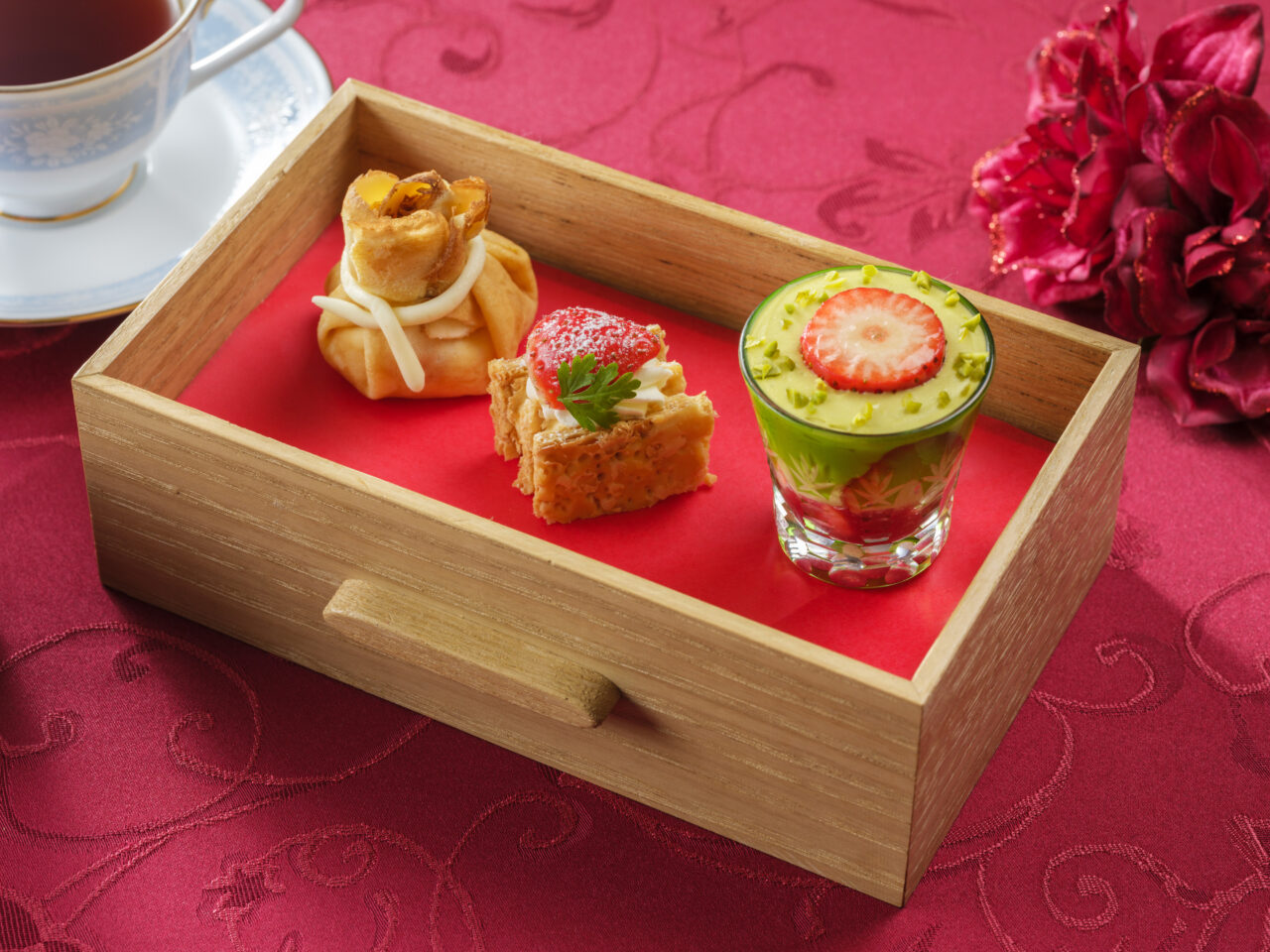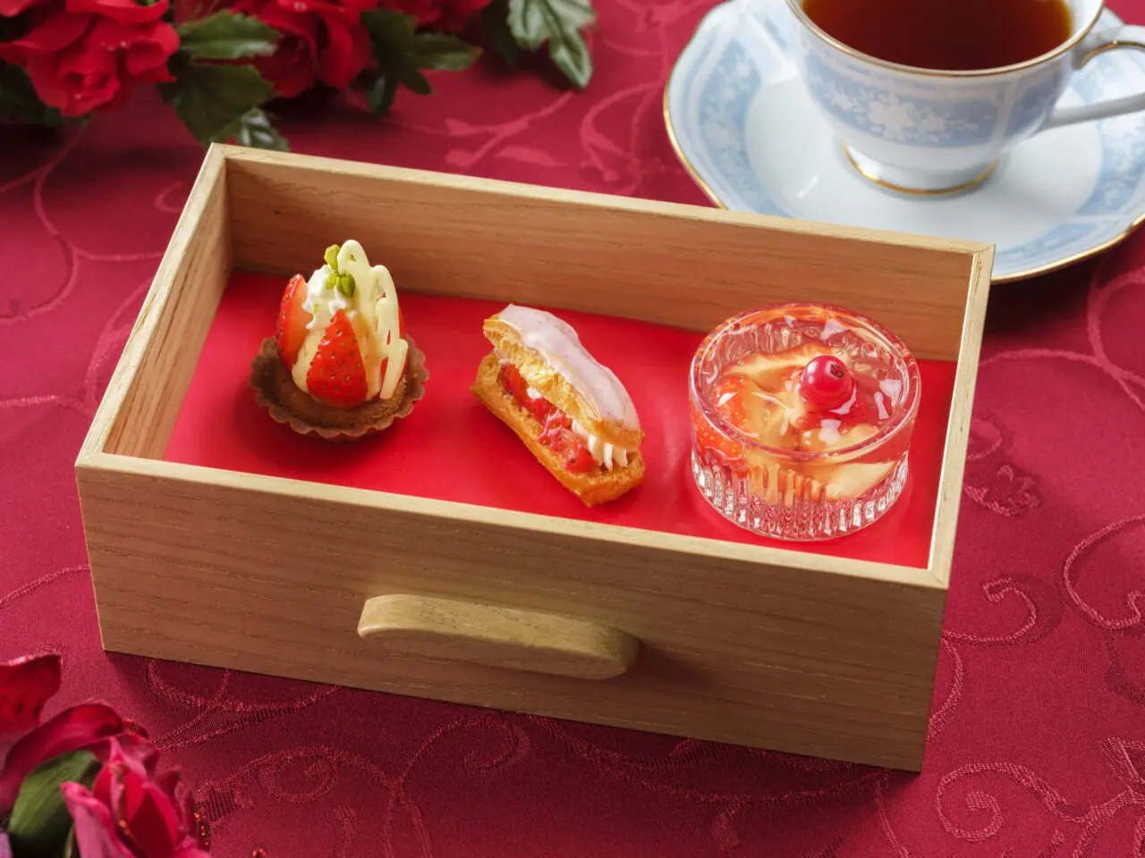 オリジナルの木箱の引き出しの中にあるのは、華やかないちごのスイーツ。いちごのタルトやミルフィーユ、いちごのエクレア、いちごと神戸ワインのジュレなど、いちごならではの甘みと酸味を活かしたスイーツが並びます。