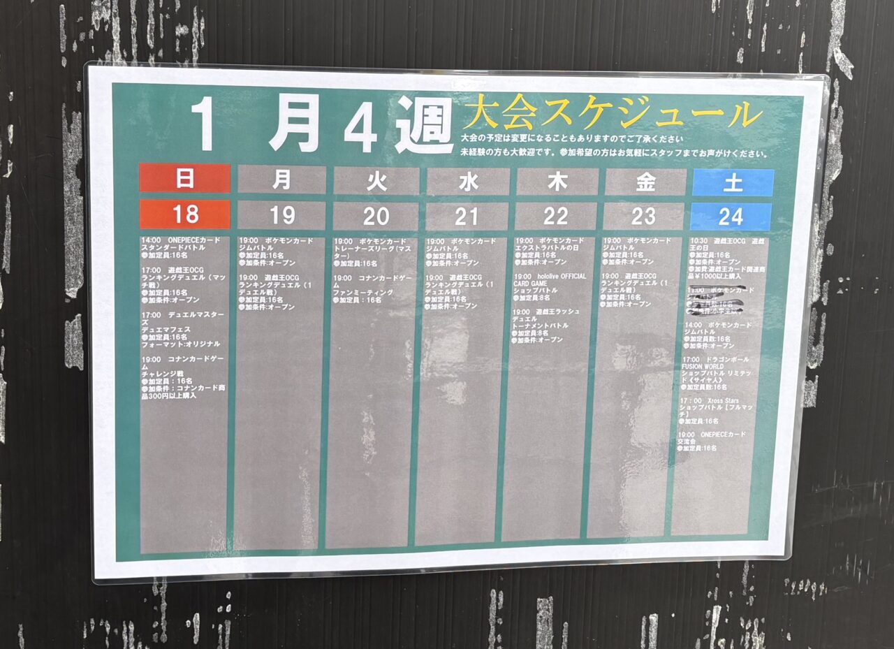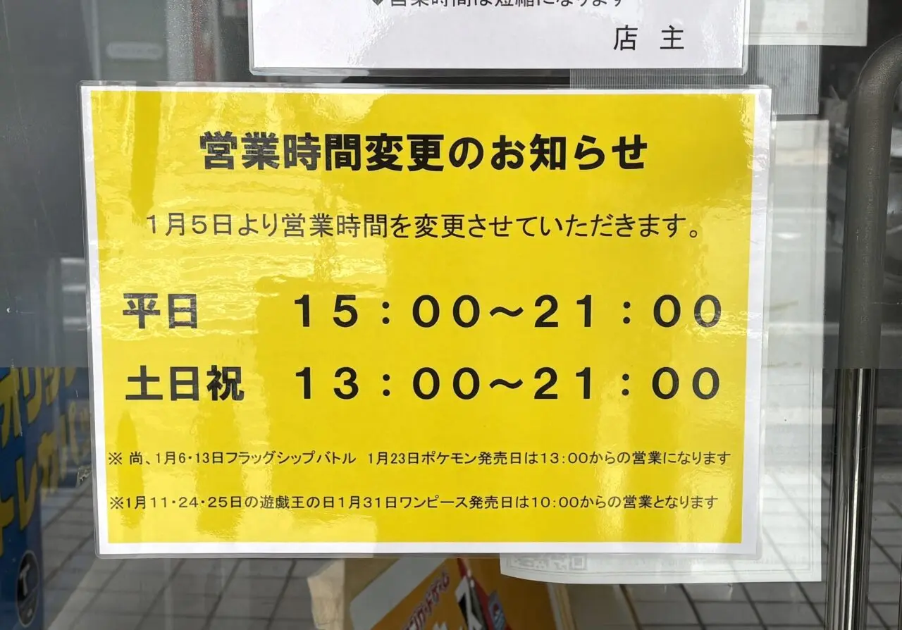 また、1月23日のポケモン発売日は13:00からの営業、1月11・24・25日の遊戯王の日、1月31日ワンピース発売日は10:00からの営業となるようです。お出かけ予定の方はどうぞお気をつけくださいね。