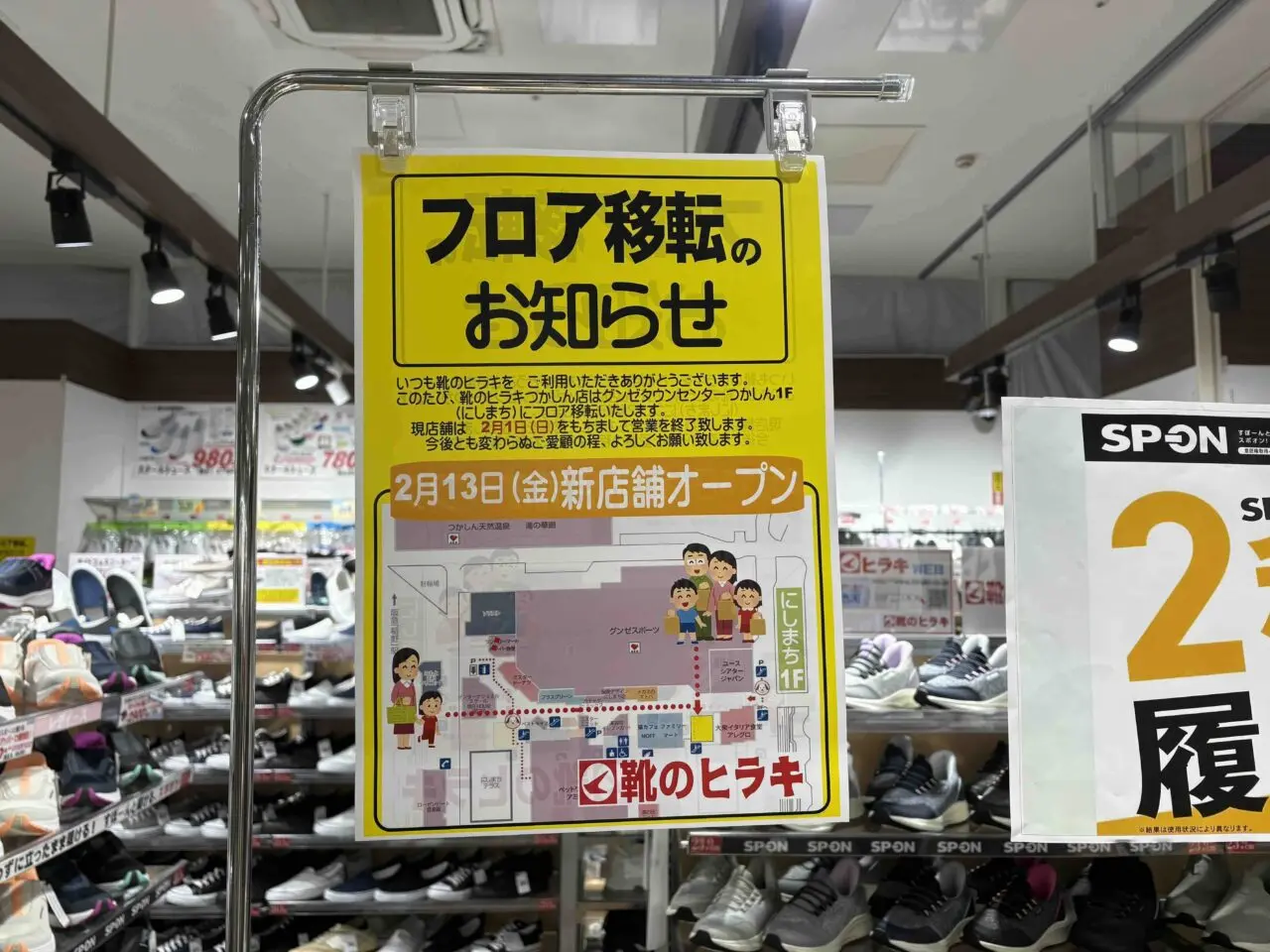 グンゼタウンセンターつかしん、ひがしまち2階にある「靴のヒラキ」がフロアを移転、館内でお引越しとなるようです。