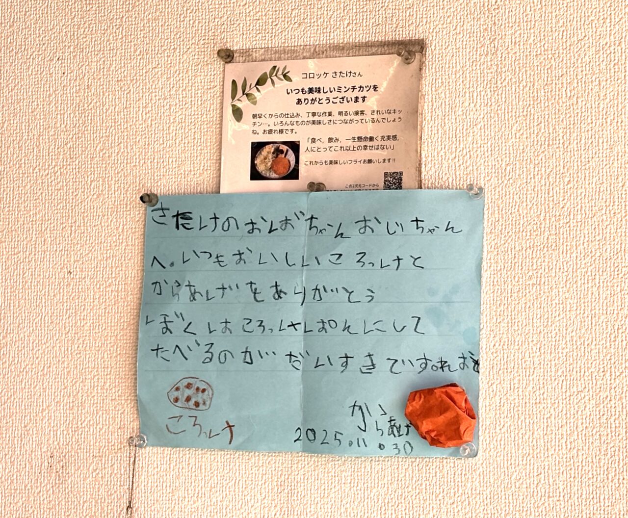 壁には「コロッケさたけ」の小さなファンの方からのお手紙も飾ってありました。