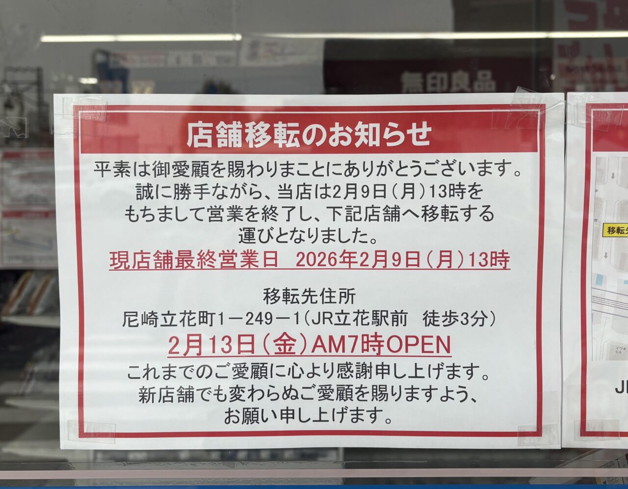 リニューアルオープンは2026年2月13日(金)朝7時とのこと。店舗名も「ローソン尼崎立花一丁目店」から「ローソン尼崎立花駅東店」に変更となります。