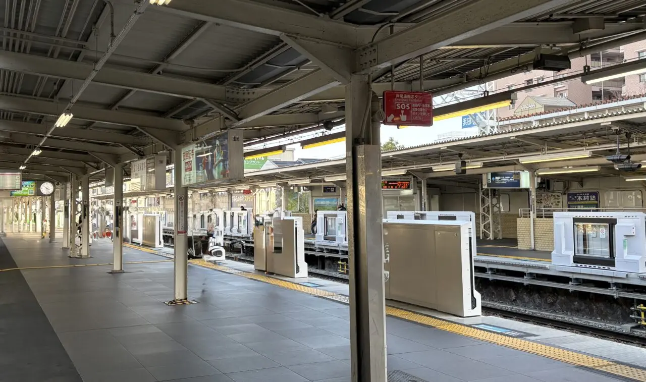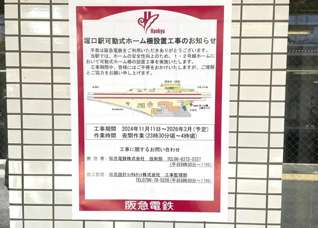 2024年11月から工事がはじまっていた阪急塚口駅のホームドア(可動式ホーム柵)の設置工事がそろそろ終了、2026年4月より供用がはじまるようです。