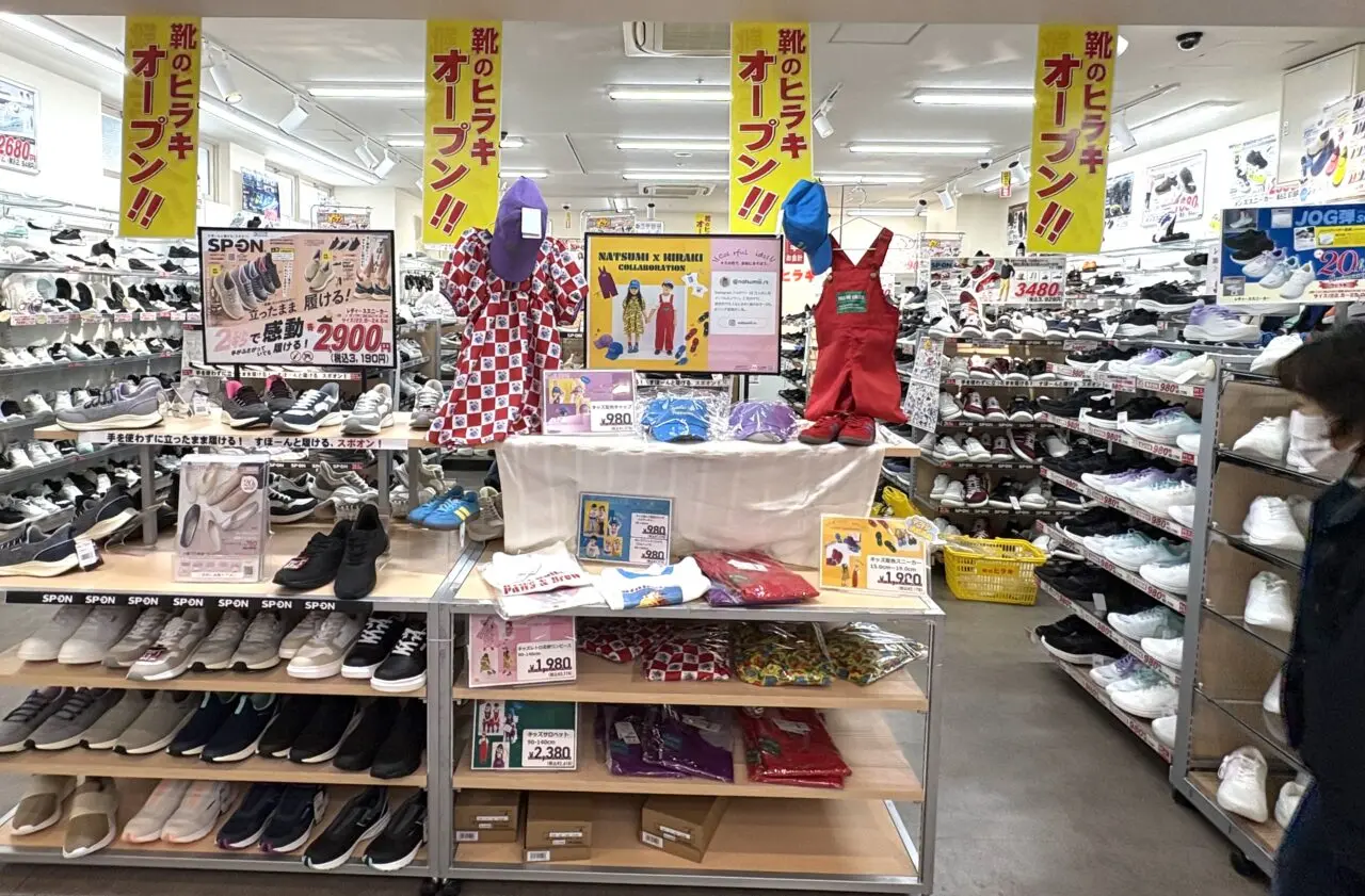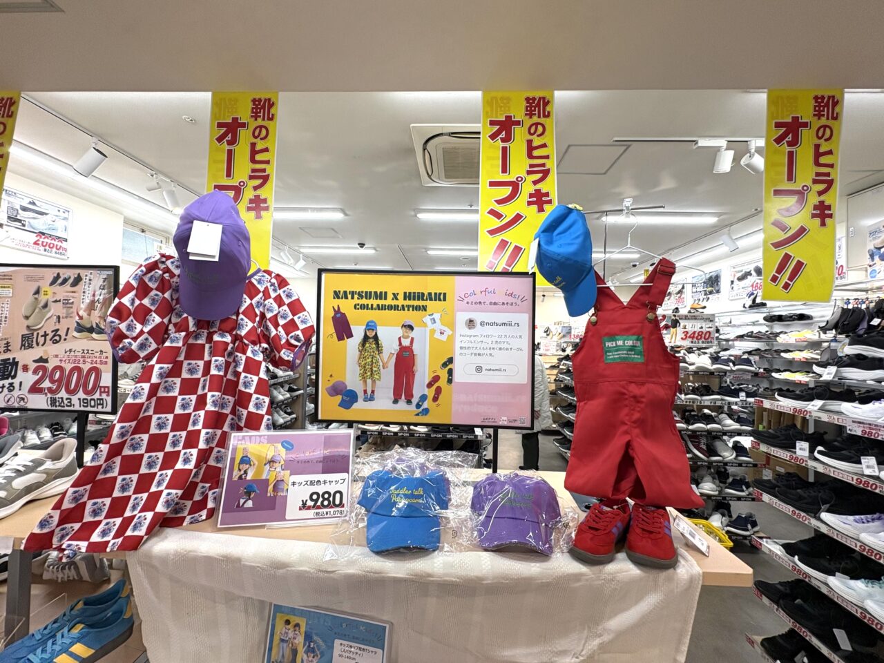 第一弾は「@natsumiii.rs」さんとのコラボ商品の「NATSUMI×HIRAKI」。キッズの靴やアパレル、雑貨などがラインナップされています。尼崎市内にある「靴のヒラキ」の店舗をのぞいてみたところ、すでに店頭に並んでいましたよ♪