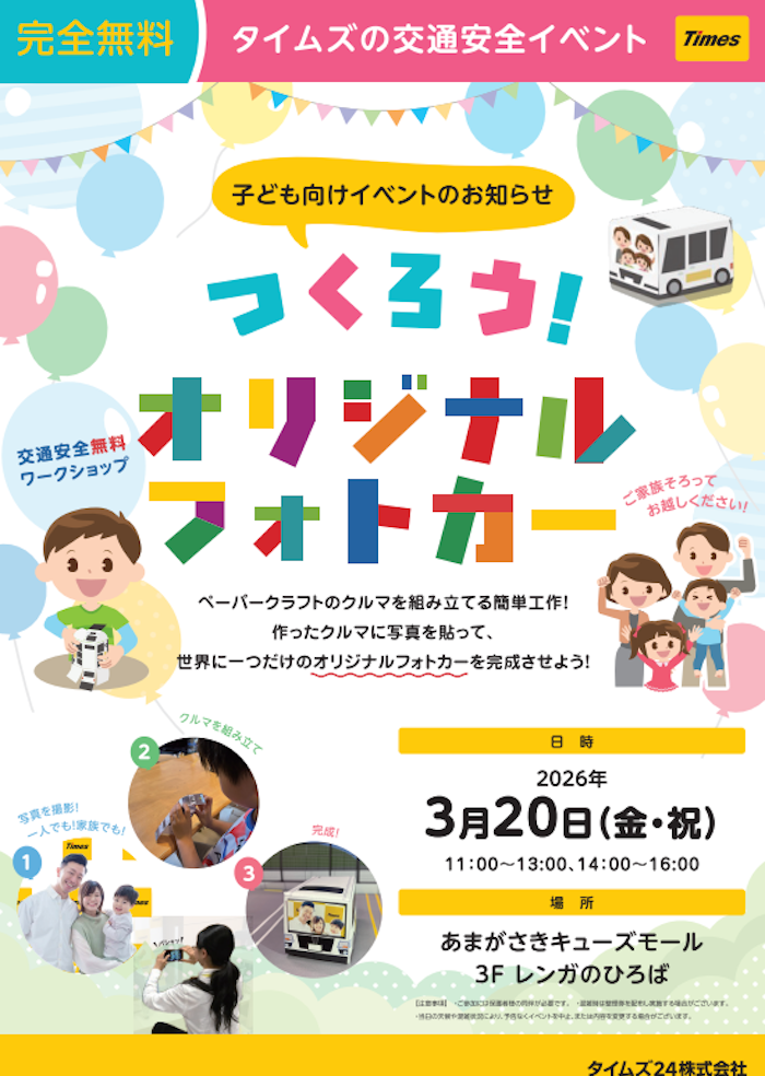 タイムズ主催の交通安全イベント「つくろう!オリジナルフォトカー」が、あまがさきキューズモールのレンガのひろばにて開催されます。