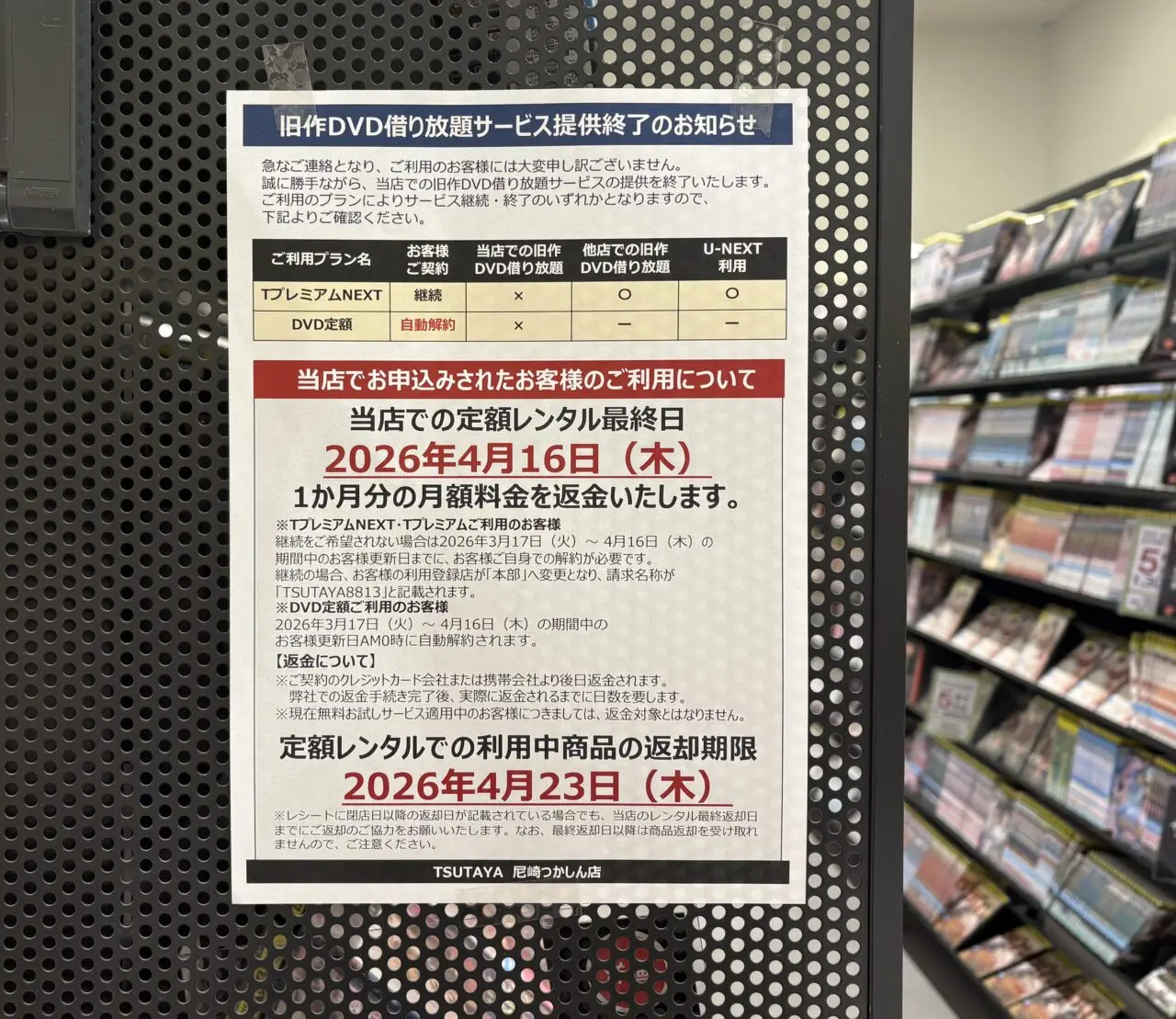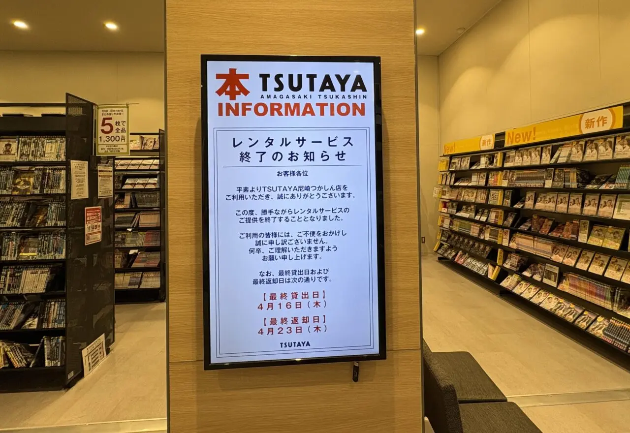 【尼崎市】最終貸出日は4月16日。TSUTAYA尼崎つかしん店のレンタルサービスが終了になるようです。
