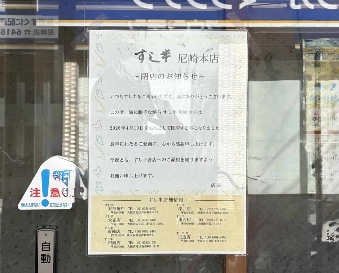 尼崎から「すし半」がなくなるなんて・・これはショックですね。閉店日は2026年4月19日のようです。