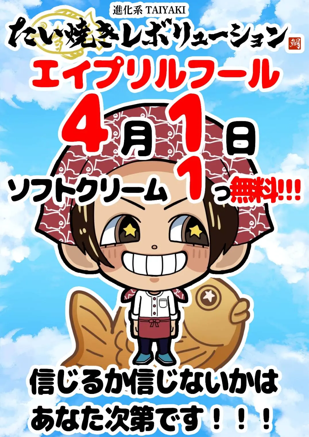 【尼崎市】4月1日はソフトクリームひとつが無料!たい焼きレボリューションで「エイプリルフールセール」を開催します♪