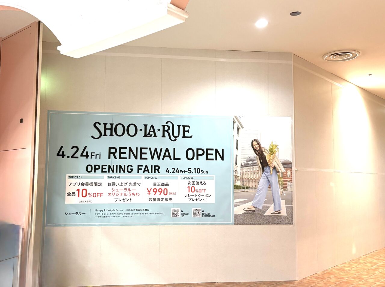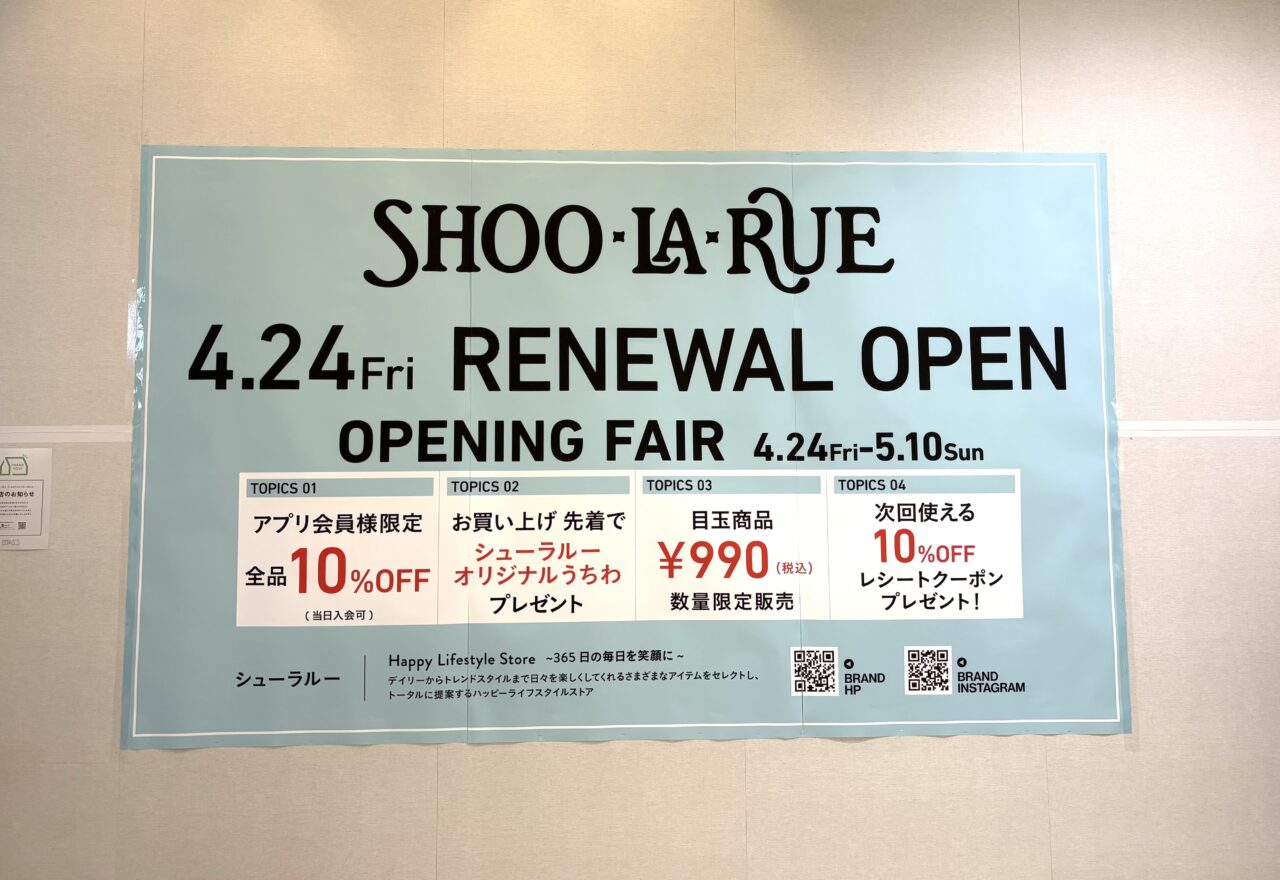 オープンセールは2026年4月24日から5月10日まで。アプリ会員限定10%OFFや先着でシューラルーオリジナルうちわのプレゼント、990円の目玉商品や次回使える10%OFFレシートクーポンプレゼントなど、うれしいおトクも盛りだくさん!これは行かなきゃですね。