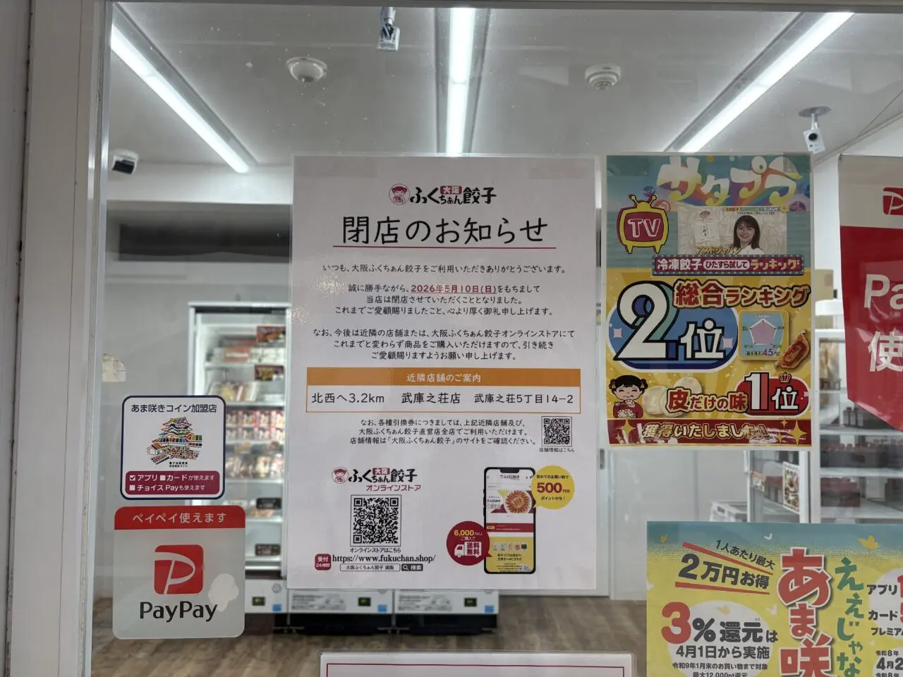 現在、尼崎市内にある「大阪ふくちぁん餃子」の無人店舗は2店舗、立花商店街店が閉店すると武庫之郷交差点そばにある「武庫之荘店」のみとなります。