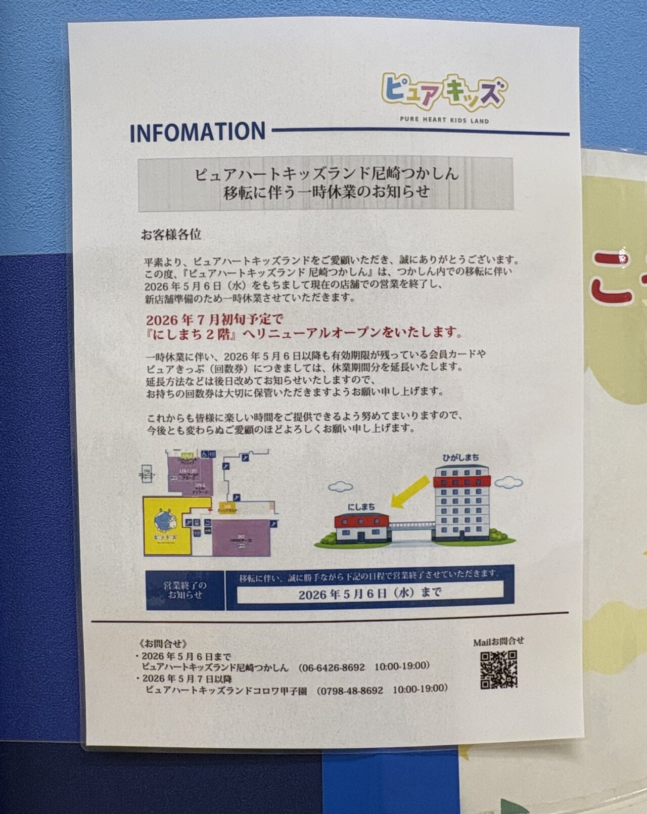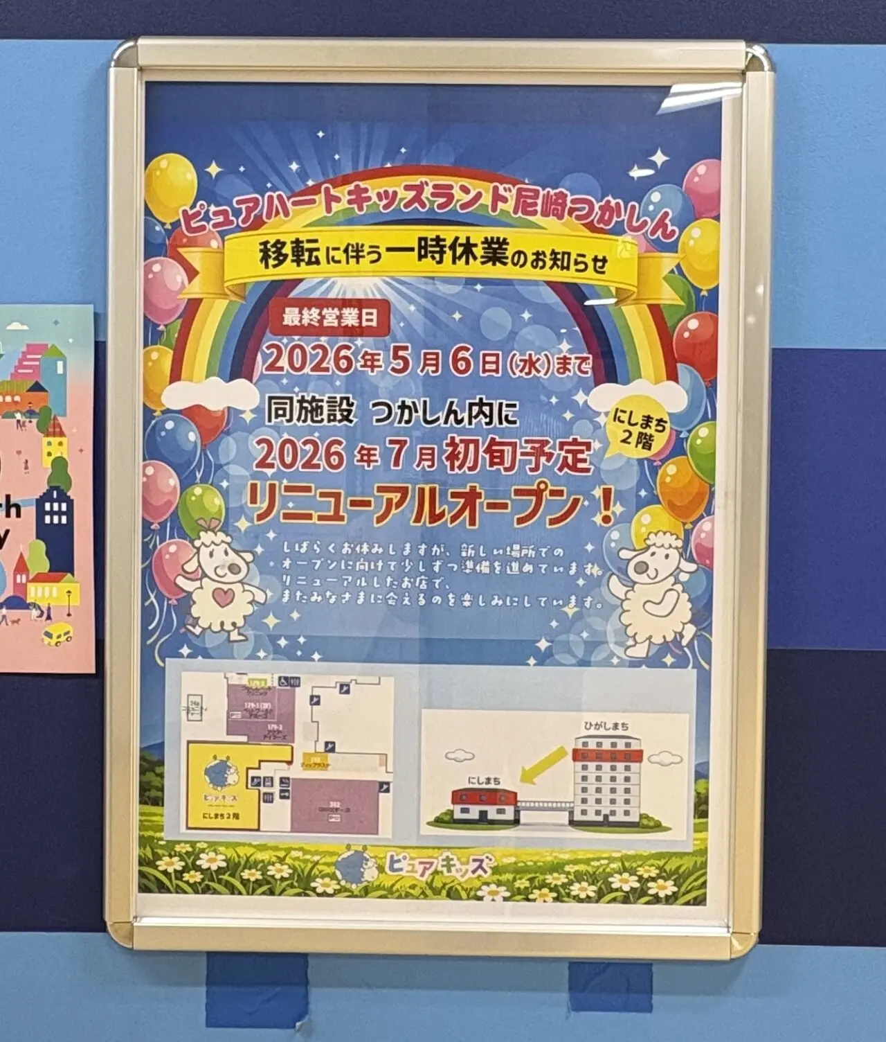 グンゼタウンセンターつかしん、ひがしまち6階にある「ピュアハートキッズランド尼崎つかしん」がつかしん館内での移転のため、一時休業に入ります。